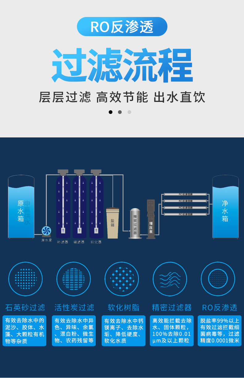 Pre treatment: generally includes raw water pump, dosing device, quartz sand filter, activated carbon filter, precision filter, etc. Its main function is to reduce the pollution index of raw water and other impurities such as residual chlorine, in order to meet the inlet requirements of reverse osmosis. The equipment configuration of the pretreatment system should be determined according to the specific situation of the raw water.