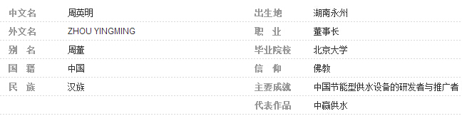 周英明,湖南永州人,中國節能型供水設備的研發者與推廣者,長沙中贏供水設備有限公司董事長兼CEO ,曾榮獲“供水行業創新獎”、“中國青年創業獎”等榮譽稱號,被譽為“中國節能供水第一人”、“中國草根創業第一人”。中贏供水創始人,代表作品有《ZYW穩壓補償式無負壓疊壓供水設備》、《ZYH變頻恒壓給水設備》、《管網水箱串聯式高層恒壓供水設備》、《罐式管網直聯型自來水增壓供水設備》等。